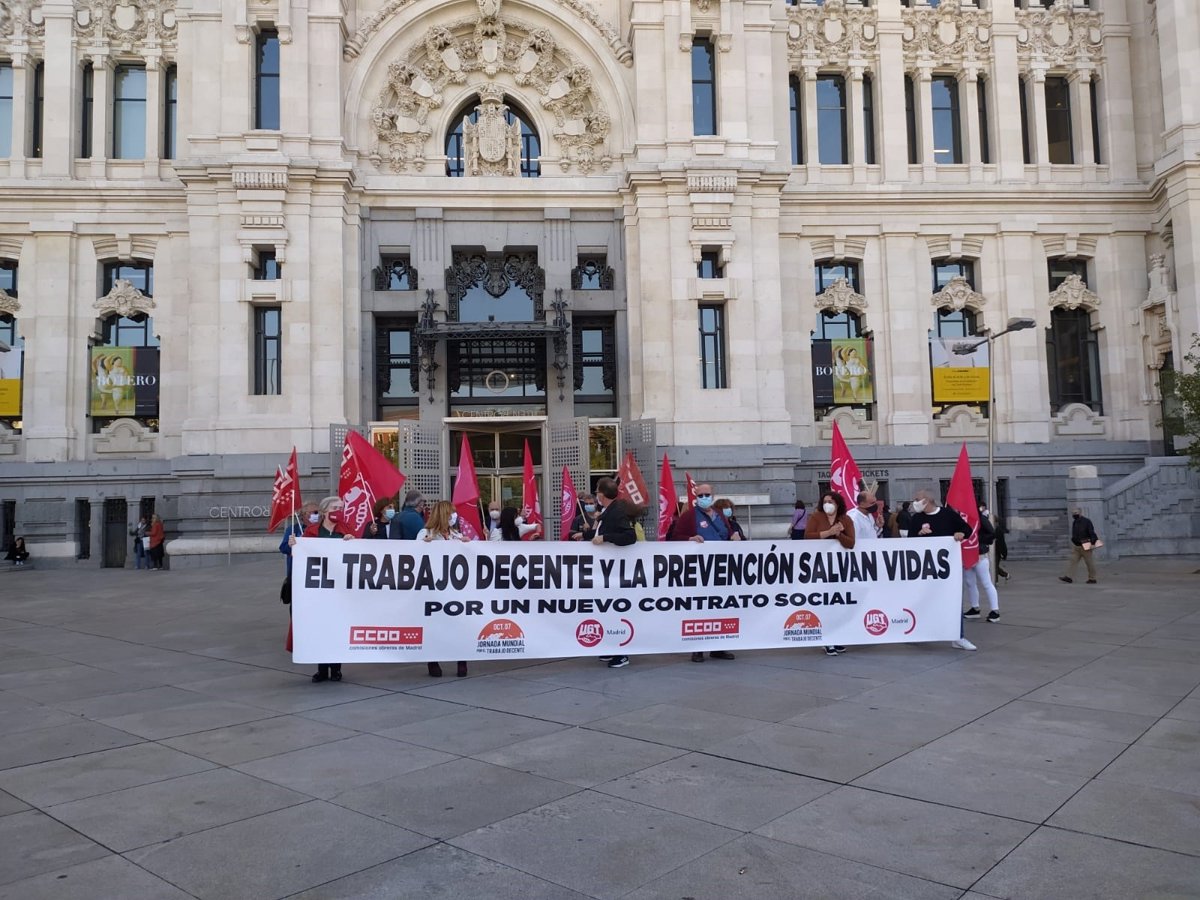 Concentración organizada por CCOO y UGT en la plaza de Cibeles por el trabajo decente. - EUROPA PRESS