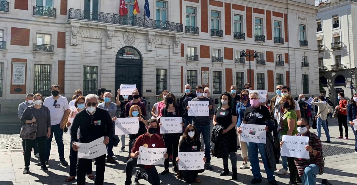 En la concentración han mostrado una pancarta en la que se podía leer 'Lo público salva vidas. Salvemos Madrid. Madrid no se segrega', además de diferentes carteles a través de los cuales han reclamado 'refuerzo de centros de salud' y 'más transporte público'.