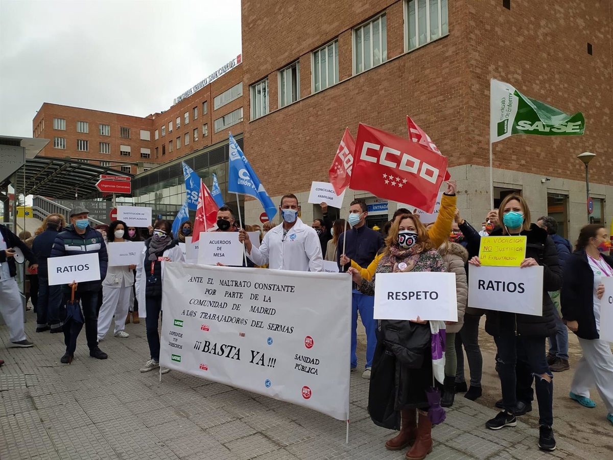 Los cinco sindicatos presentes en la Mesa Sectorial de la sanidad pública de la Comunidad de Madrid --Satse, CC.OO., Amyts, CSIT Unión Profesional Y UGT-- se han concentrado esta mañana frente al Hospital Clínico San Carlos para pedir que se trata con "respeto" a los profesionales sanitarios de la Comunidad de Madrid y que se mejoren sus condiciones de trabajo ante el "maltrato constante" que sufren.