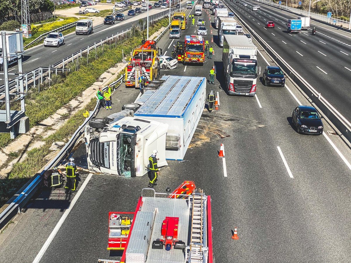 El accidente ocurrió sobre las 9 horas de este lunes en el kilómetro 24 de la autovía, sentido Madrid, a la altura de la localidad de las Rozas. Por causas que investiga la Guardia Civil de Tráfico, el conductor del camión ha perdido el control, colisionó contra un guardarraíl y ha quedado cruzado y volcado sobre la carretera.