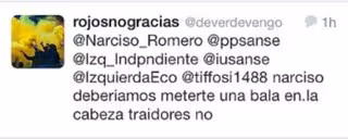En concreto, el dirigente socialista recibió el pasado 23 de octubre a través de su perfil en la red social Twitter (@Narciso_Romero) el siguiente mensaje por parte del usuario @deverdevengo(cuyo apodo en Twitter era "rojosnogracias"): "Narciso deberíamos meterte una bala en la cabeza. Traidores no". En marzo, Romero consiguió aplazar la vista en la que pretendían juzgarle por faltas y no por amenazas.