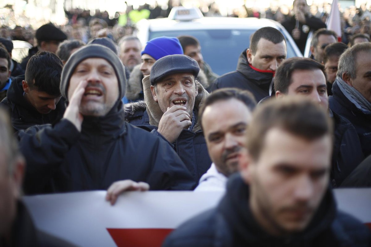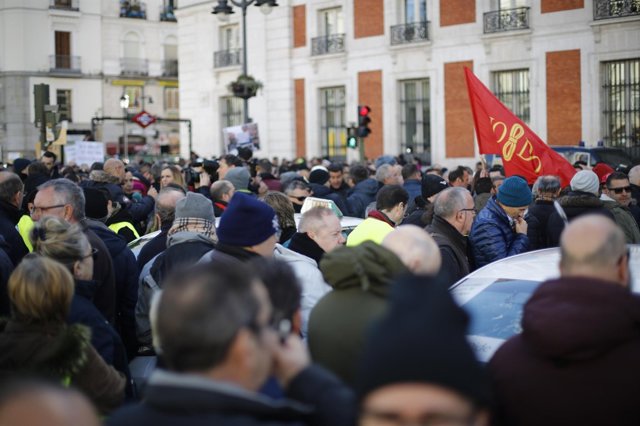 Los taxistas han llenado la Puerta del Sol tras la reunión entre las asociaciones del sector y el presidente de la Comunidad de Madrid, Ángel Garrido, que ha finalizado sin acuerdo. Durante la protesta, se han escuchado consignas como "Guerra, guerra, guerra", "Ni un paso atrás" y " Manos arriba, esto es un atraco".