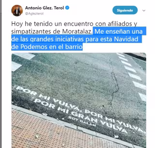 El vicesecretario de Territorial del PP de Madrid, Antonio González Terol, ha ironizado calificando de "gran iniciativa" para Navidad el verso de Roy Galán de "Por mi vulva, Por mi vulva, por mi gran vulva", rotulado en un paso de peatones en el barrio de Moratalaz, en la capital.