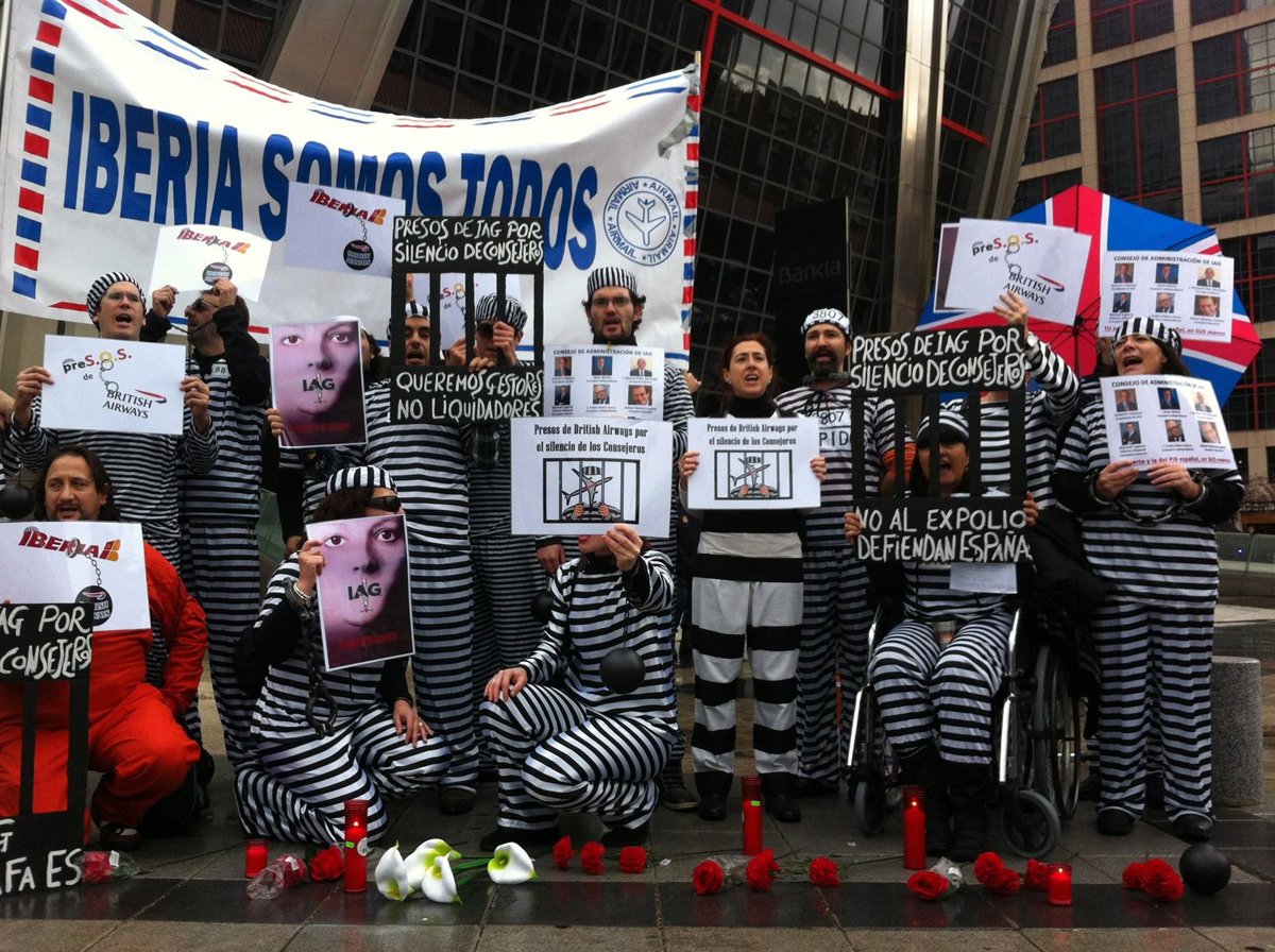 Disfrazados de presos y esposados con grilletes, los empleados han protestado ante la sede de la entidad, al considerar que son "prisioneros de IAG por el silencio de sus consejeros".