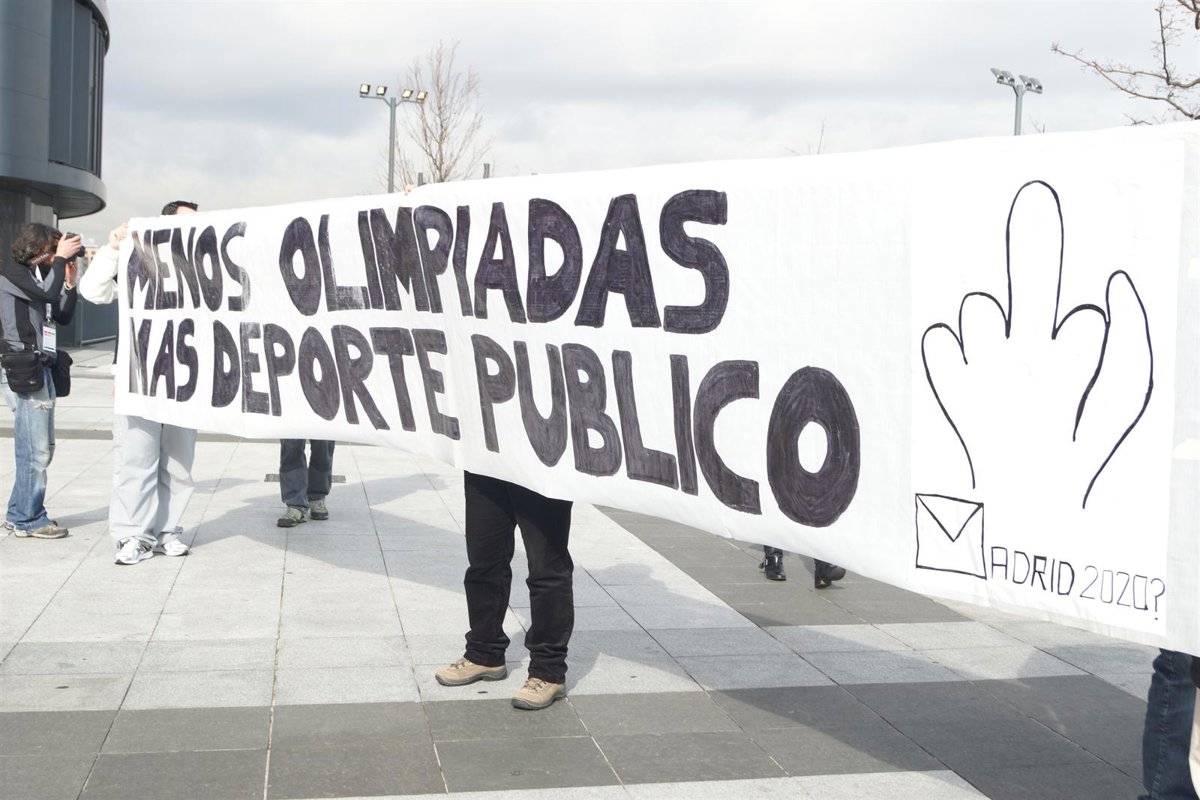 Una decena de representantes sindicales del Ayuntamiento de Madrid se han concentrado desde primera hora de este martes junto a la entrada del hotel Eurostars Tower Madrid, centro de operaciones de la prensa y de la Comisión de Evaluación del Comité Olímpico Internacional (COI), con una pancarta en la que hacen una 'peineta' a la candidatura olímpica y en la que exigen 'Menos olimpiadas y más deporte público'.