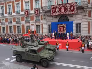 Finalmente, para concluir este acto, ha tenido lugar el desfile de las tropas y vehículos, que la expresidenta Aguirre ha seguido junto a una de sus nietas en brazos, la primera vez en muchos años fuera de la tribuna de autoridades.