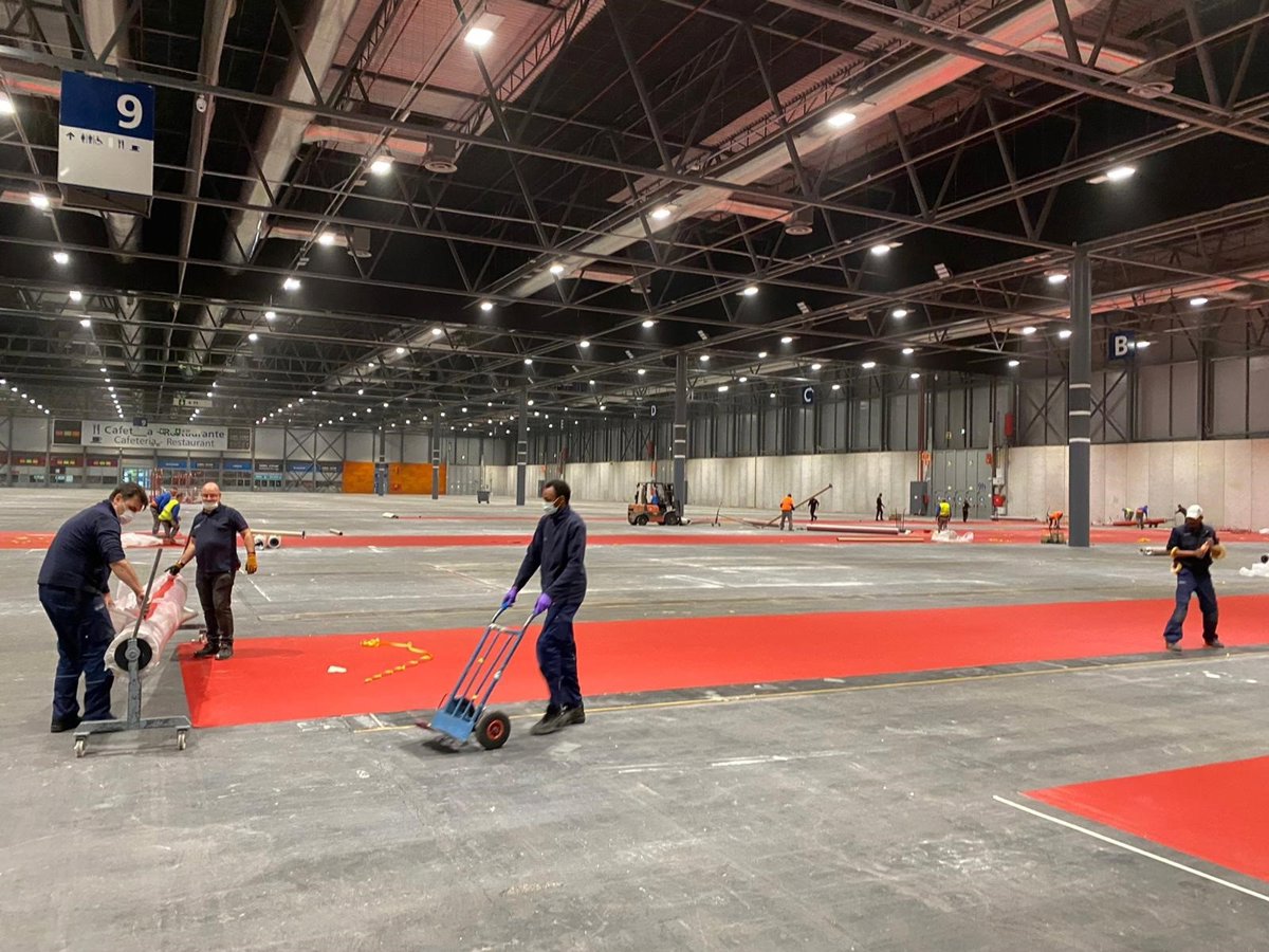 Desde el Gobierno regional distribuyeron ayer unas imágenes en las que se ve a operararios, protegidos con mascarillas, en el pabellón 9, comenzando las labores de montaje. En primer lugar, han colocado un tapiz sobre el suelo original.