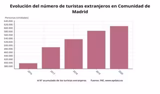 La Comunidad de Madrid recibió un total de 611.422 turistas internacionales durante el mes de enero, lo que supone un aumento del 4,6 por ciento con respecto al mismo periodo de 2019, según los datos de la encuesta Frontur publicada por el Instituto Nacional de Estadística (INE).