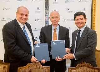 El rector de la Universidad Politécnica de Madrid, Carlos Conde, y el director general de UCB, Jesús Sobrino, han firmado un convenio de colaboración para la creación de la 'Cátedra UPM-UCB de Medicina Traslacional', que se desarrollará en el Centro de Tecnología Biomédica (CTB-UPM).