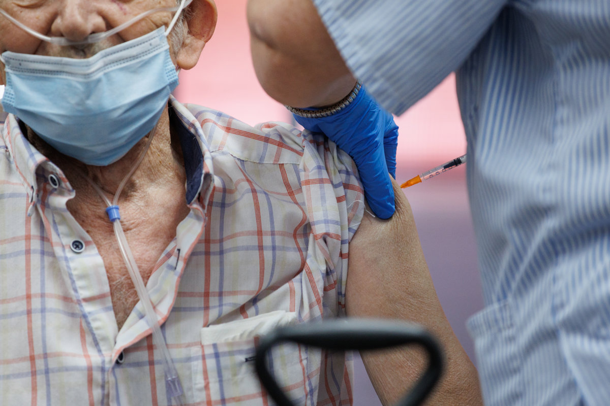 Un enfermero vacuna de la dosis Moderna a un anciano durante el inicio de la administración de la cuarta dosis de la vacuna frente al COVID-19 a los usuarios y trabajadores sociosanitarios de residencias, en la Residencia pública de Mayores de Vallecas - Alejandro Martínez Vélez - Europa Press