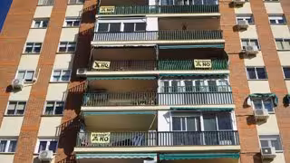 Imagen de un bloque de viviendas con carteles en apoyo al cierre del vertedero en Alcalá. - PLATAFORMA VECINAL DE ALCALÁ 'VERTEDERO NO'