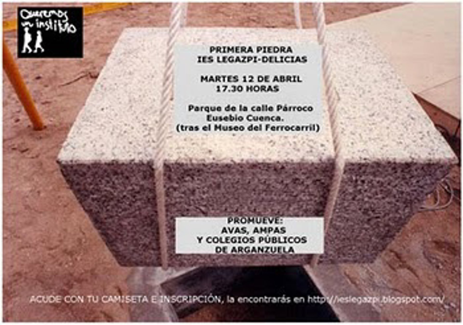 Vecinos del distrito de Arganzuela colocarán de forma sinbólica este martes, 12 de abril, la primera piedra de un Instituto de Educación Secundaria (IES), en la parcela situada frente a la antigua estación de autobuses de Delicias, junto a la calle Párroco Eusebio Cuenca, para demostrar al Gobierno regional que hay "demanda" de un centro de estas características.