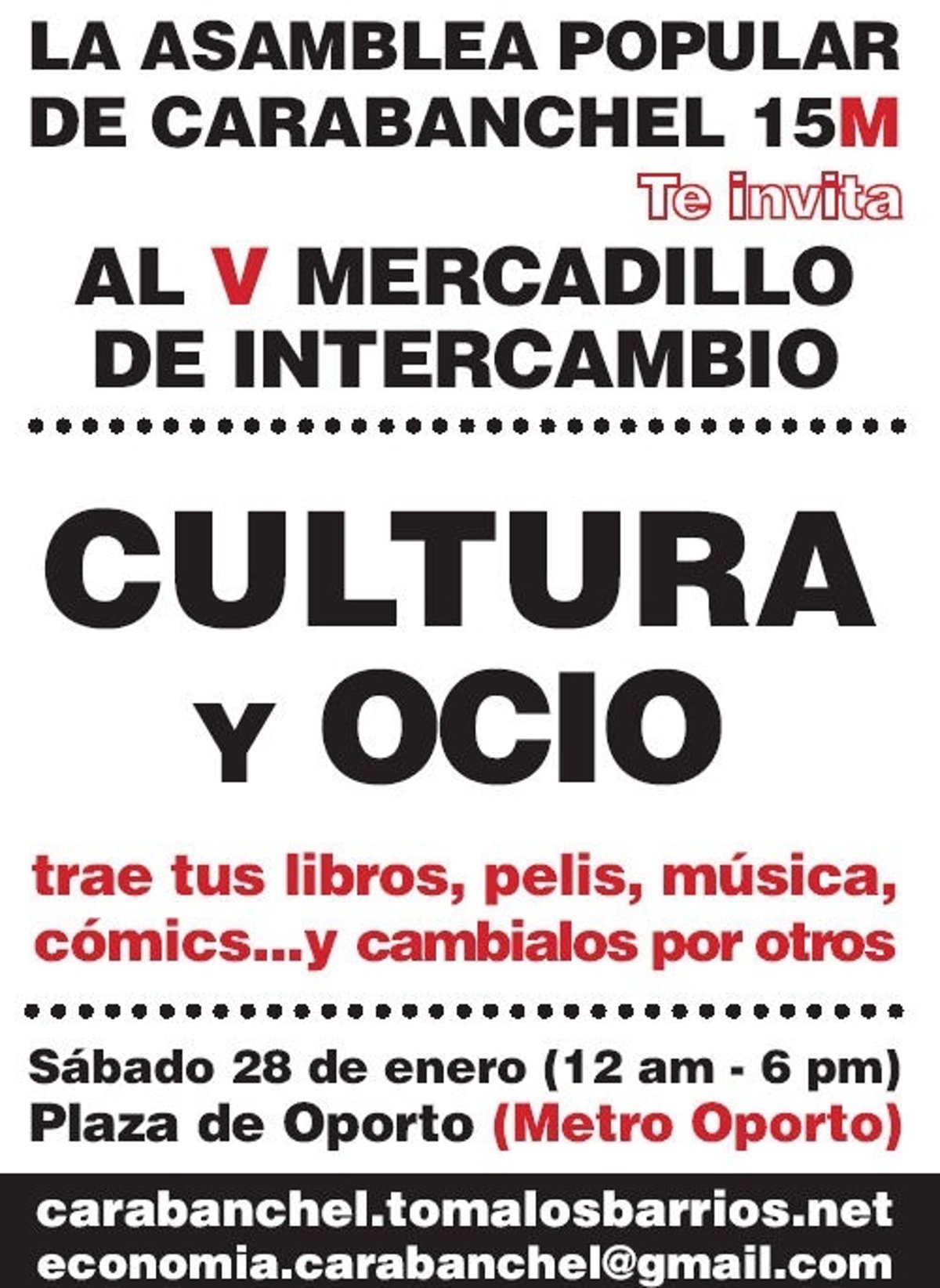 Será la quinta vez que esta asamblea del barrio organiza un mercado de intercambio de objetos, en el cual los vecinos podrán dar salida a libros, películas, música, revistas y demás artículos relacionados con ocio y cultura que no tengan interés en guardar en sus casas.