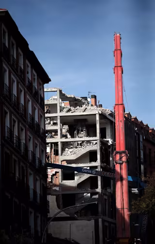 Una grúa trabaja en la demolición de la planta sexta del edificio de la calle Toledo 98 que, el pasado día 20 sufrió una explosión por un escape de gas, en Madrid (España), a 27 de enero de 2021. Los vecinos del bloque de viviendas número 102 podrán vo - Eduardo Parra - Europa Press