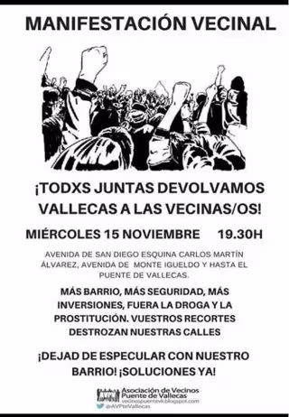 "Desde hace más de veinte años, el casco histórico del Puente de Vallecas vive un deterioro muy difícil de soportar y sus habitantes no están dispuestos a seguir aguantando más esta situación en sus casas, comercios, calles y plazas. El patrimonio histórico, múltiples viviendas y locales de estos barrios están en manos de la especulación inmobiliaria de bancos y fondos de inversión, consintiendo ocupaciones mafiosas y la proliferación de 'narcopisos' y prostíbulos, con el resultado de un aumento de la degradación de las calles", han señalado.