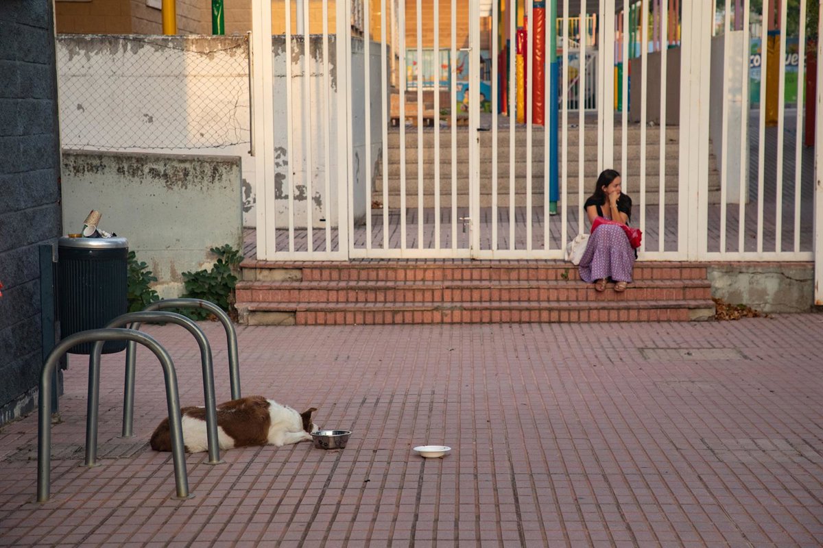 Una mujer y un perro en el Espacio Enrique Mas dónde han pasado la noche los vecinos desalojados por el incendio, a 12 de agosto de 2025, en Tres Cantos, Madrid (España). - Rafael Bastante - Europa Press