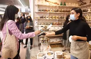 La vicealcaldesa de Madrid, Begoña Villacís (i), paga a través de su móvil en una tienda durante su visita al mercado de Santa María de la Cabeza, en Madrid - Eduardo Parra - Europa Press
