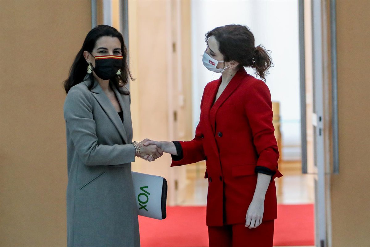 Archivo - La presidenta de la Comunidad de Madrid, Isabel Díaz Ayuso (d), y la portavoz del Grupo Parlamentario de Vox, Rocío Monasterio (i), se saludan a su llegada a una reunión en la Real Casa de Correos, sede de la Presidencia de la Comunidad de Ma - Ricardo Rubio - Europa Press - Archivo