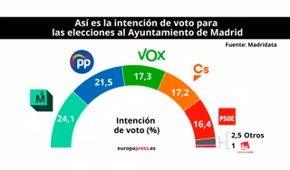 Vox adelanta también a Ciudadanos en el Ayuntamiento de Madrid y se convierte, con un 17,3 por ciento de intención de voto, en la tercera fuerza política mientras que Más Madrid sigue en primer lugar seguido del PP, si bien ambas formaciones registran un descenso en sus perspectivas electorales (del 1,7 y el 1% respectivamente), según el último barómetro 'Madridata' de Telemadrid sobre las próximas elecciones municipales.