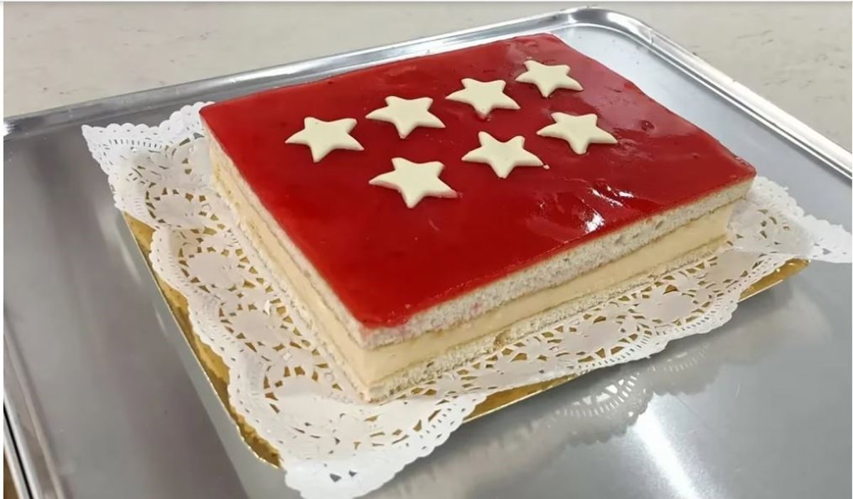 La Asociación de Empresarios Artesanos del sector de Pastelería de Madrid (ASEMPAS) ha detallado que el postre consiste en un bizcocho de almendra con crema pastelera, nata, sabor a naranja y una gelatina de fresa para reproducir la bandera y sus siete estrellas, decoradas en mazapán, azúcar y fondant.