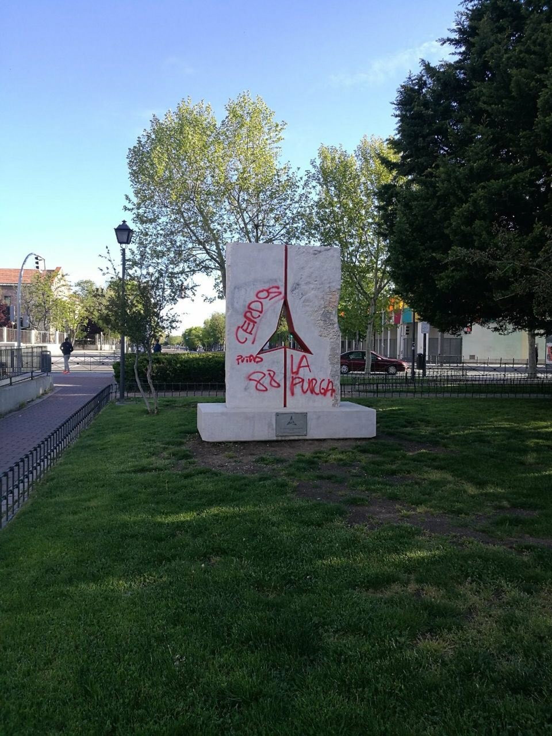 El Jardín de las Brigadas Internacionales, situado en el madrileño distrito de Vicálvaro, ha amanecido la mañana de este martes con su escultura pintadas con simbología y lemas nazis y con la placa de la calle tumbada.