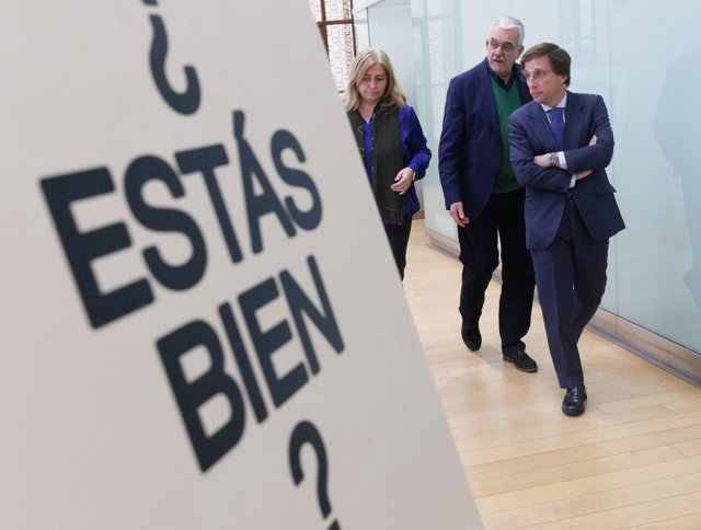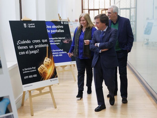 a delegada de Seguridad y Emergencias y portavoz municipal, Inmaculada Sanz; el gerente de Madrid Salud, Antonio Prieto, y el alcalde de Madrid, José Luis Martínez-Almeida, observan carteles de las distintas campañas de Madrid Salud