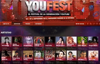 Por primera vez en la historia, muchos de los artistas más vistos y compartidos en YouTube se presentarán en vivo en Madrid dentro de YouFest. YouFest es el festival de la Generación YouTube, cuya primera edición ha elegido a Madrid como sede para celebrarse los días 28 y 29 de septiembre. Un evento multidisciplinar en el que participarán las grandes estrellas que han llegado a todos los rincones del planeta gracias a la viralidad de su propio talento y al apoyo de la comunidad de usuarios.