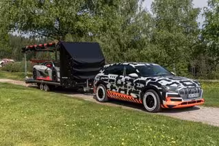 La firma de los cuatro aros informó en un comunicado que su nuevo todocamino eléctrico remolcará al e-tron Vision Gran Turismo, un concept car que la compañía alemana desarrolló exclusivamente para las carreteras virtuales de los videojuegos, y que ahora ha convertido en realidad.