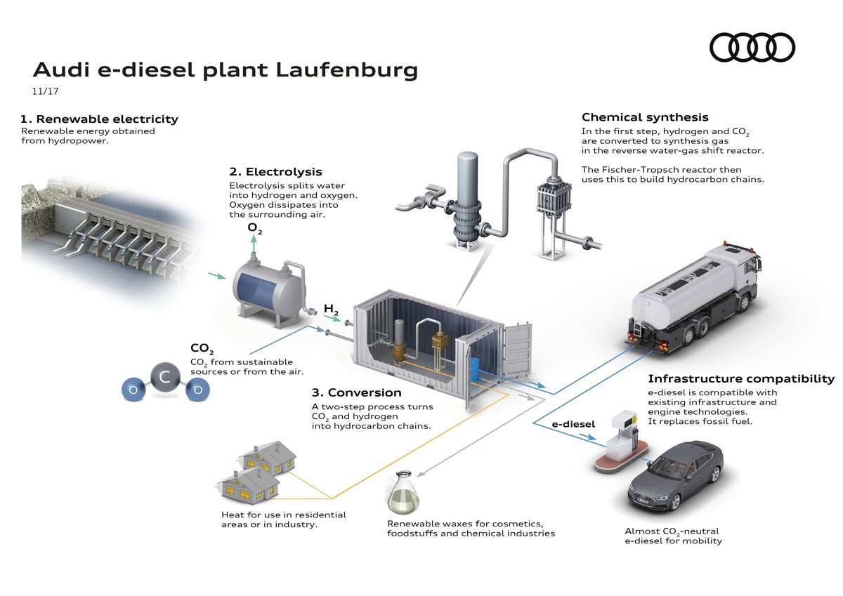 La energía generada en la estación hidroeléctrica produce hidrógeno y oxígeno a partir del agua. En la fase siguiente, el hidrógeno reacciona con CO2, y se forma una cadena larga de compuestos de hidrocarburos. En la etapa final del proceso, estos son separados en los productos finales Audi e-diesel y también en ceras, que se utilizan en otras áreas de la industria.