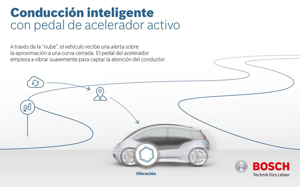 Bosch afirmó que el pie derecho del conductor es el responsable del 25% del consumo de combustible del vehículo y señaló que esta nueva ayuda técnica sirve para advertir a los conductores, a través de una vibración, de que han cruzado la línea entre acelerar con suavidad y hacerlo de forma más efusiva.