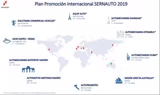 Entre las iniciativas previstas para 2019, se encuentra la organización de pabellones agrupados nacionales en las principales ferias del sector en todo el mundo como son Automechanika Istanbul (Turquía), Automechanika Dubai (Emiratos Árabes Unidos), Autopromotec (Italia), EquipAuto (Francia), Solutrans Commercial Vehicles (Francia), AAPEX (Las Vegas, Estados Unidos) y Automechanika Shanghai (China).