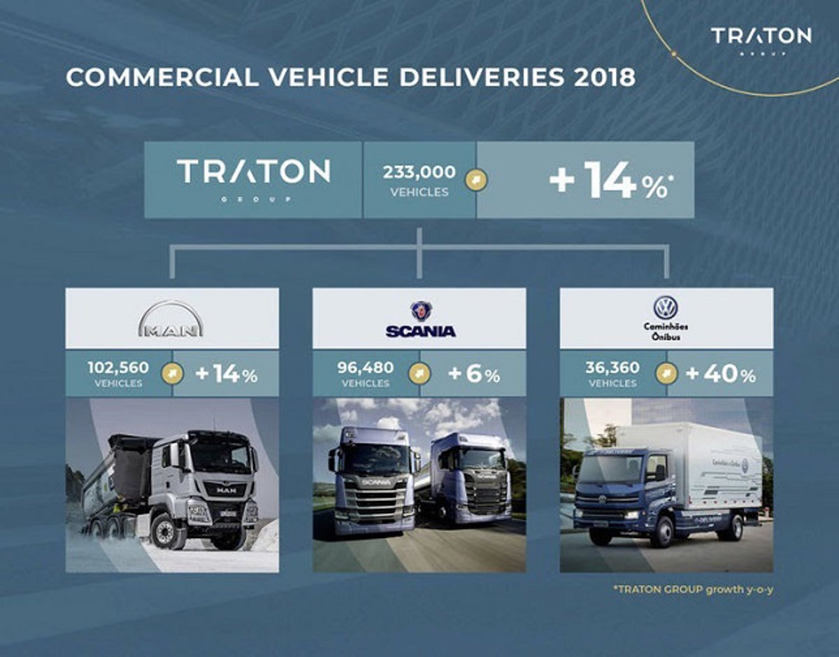 Traton, la antigua Volkswagen Truck & Bus y que engloba las marcas MAN, Scania y Volkswagen Caminhes e nibus del grupo Volkswagen, vendió 233.000 vehículos en 2018, lo que supone un incremento del 14% respecto al ejercicio precedente, según datos publicados por la empresa.