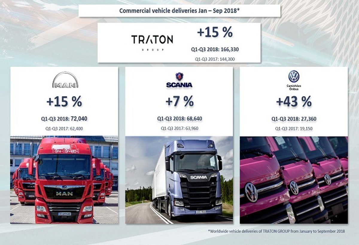 Traton, la nueva Volkswagen Truck & Bus y que engloba las marcas MAN, Scania y Volkswagen Caminhões e Ônibus del grupo Volkswagen, vendió 166.330 camiones y autobuses hasta septiembre, lo que supone un incremento del 15% respecto al mismo periodo del ejercicio anterior, según datos publicados por la empresa.