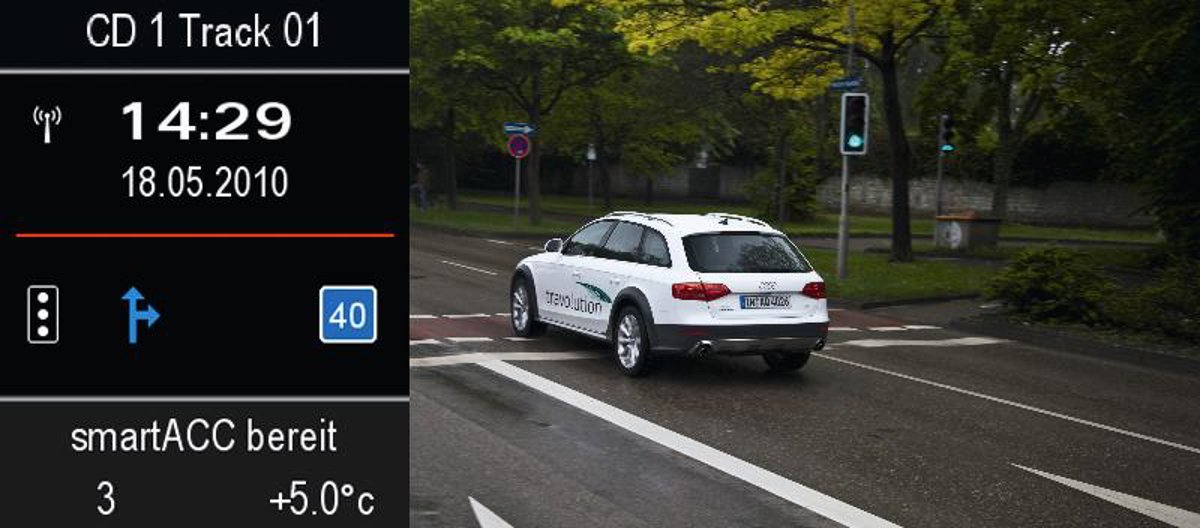 La firma de los cuatro aros indicó que este sistema podría lograr un ahorro de combustible de 700.000 litros. Audi indicó que ha puesto en marcha un proyecto piloto en su sede central en Ingolstadt en el que las señales de la ciudades están controladas por un nuevos dispositivo desarrollado por la corporación alemana y por otros socios.