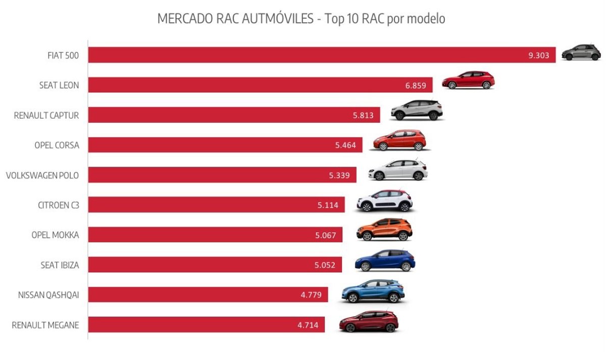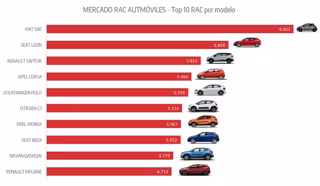 El modelo urbano de Fiat acumula 9.303 matriculaciones en el sector de las alquiladoras de automóviles, liderando una lista que, de forma conjunta, alcanza los 800.000 vehículos de alquiler circulando por las calles españolas. El segundo turismo más vendido es el Seat León, con 6.859 matriculaciones, y tercero el Renault Captur, con 5.813 unidades vendidas.