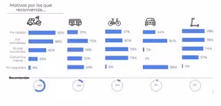 El 63% de los conductores de moto la recomienda como medio de transporte por la rapidez, la comodidad y creen que desplazarse en moto es más económico que hacerlo en transporte público, aunque menos que hacerlo en patinete o bicicleta.