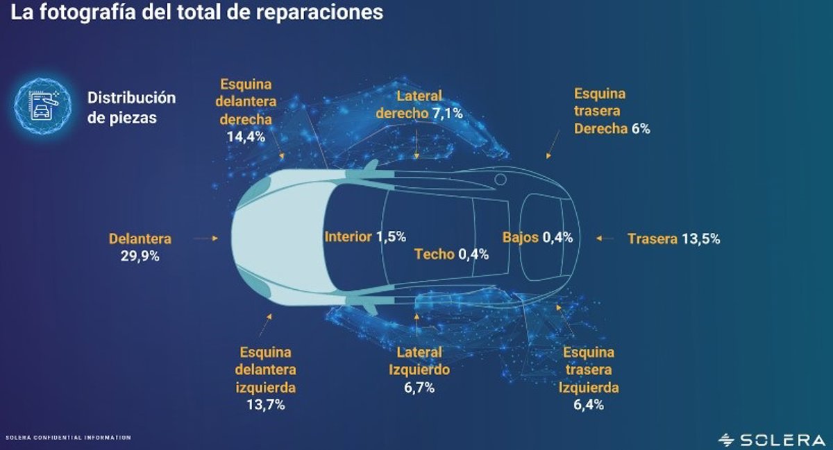 El 58% de las piezas que son reparadas en los vehículos se sitúan en la parte delantera, repartidos entre el frontal delantero (29%), la esquina delantera derecha (14,4%) y la delantera izquierda (13,7%), según ha informado este lunes la compañía de software, datos y servicios integrados de vehículos Solera.