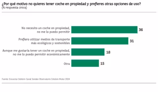 Asimismo, el 31% de los encuestados afirma que prefiere utilizar medios de transporte más sostenibles, destacando los más jóvenes entre 18 y 24 años. Por último, un 18% de los encuestados declara que, aunque le gustaría tener un coche en propiedad, no se lo puede permitir económicamente.
