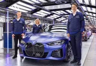 El primer BMW i4 eléctrico producido en serie ha salido este viernes de las líneas de producción de la planta de BMW Group en Múnich. - BMW GROUP