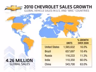 Chevrolet explicó que estos resultados se sustentan en la progresión experimentada por la firma en los países emergentes (BRIC), que concentran el 33% de sus entregas. Así, sus ventas en Brasil sumaron 657.697 unidades en 2010, un 78% más que cinco años atrás.