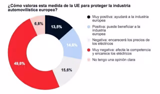 En concreto, el estudio revela que uno de cada dos encuestados (50%) considera la medida "muy negativa", y un 16%, "negativa". Por lo tanto, casi dos de cada tres encuestados le dan una mala nota a esta política que la UE impuso a finales de octubre a los fabricantes y marcas de vehículos eléctricos provenientes del gigante asiático.
