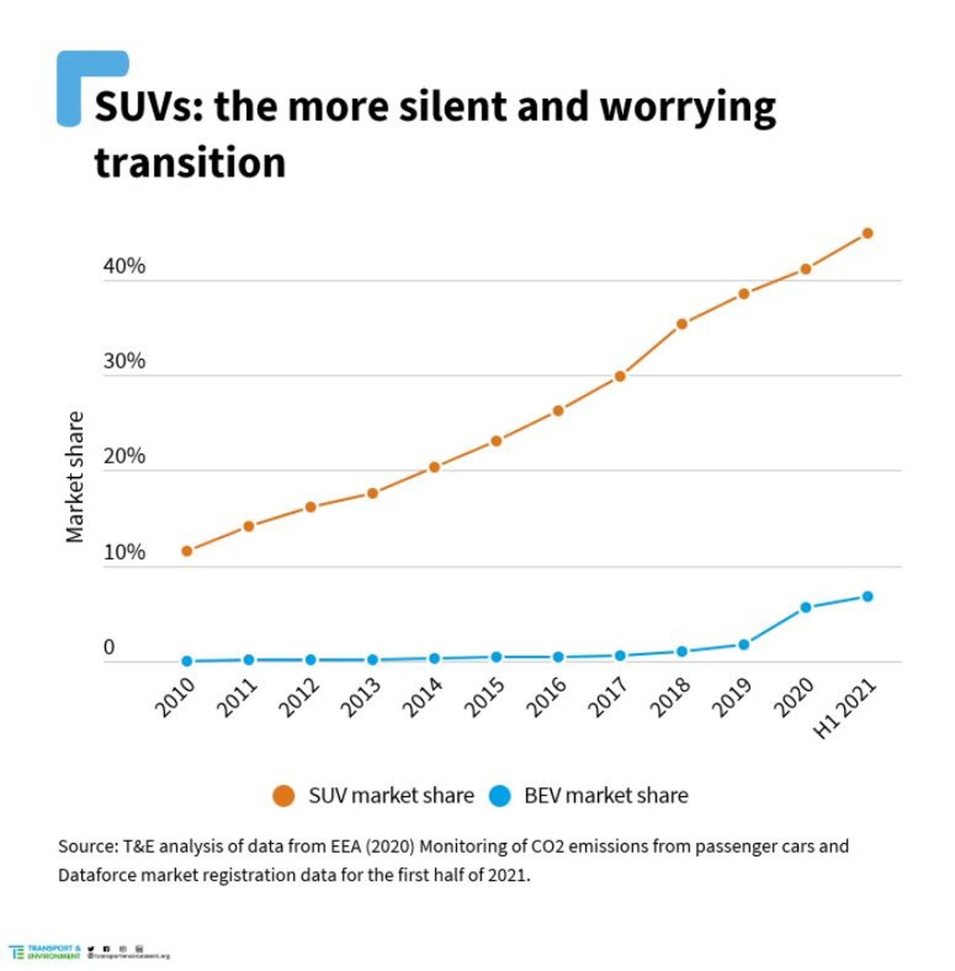 La cuota de mercado de los SUV aumentó en 4 puntos porcentuales en la primera mitad de 2021, tres veces más que los vehículos eléctricos de batería. - TRANSPORT & ENVIROMENT