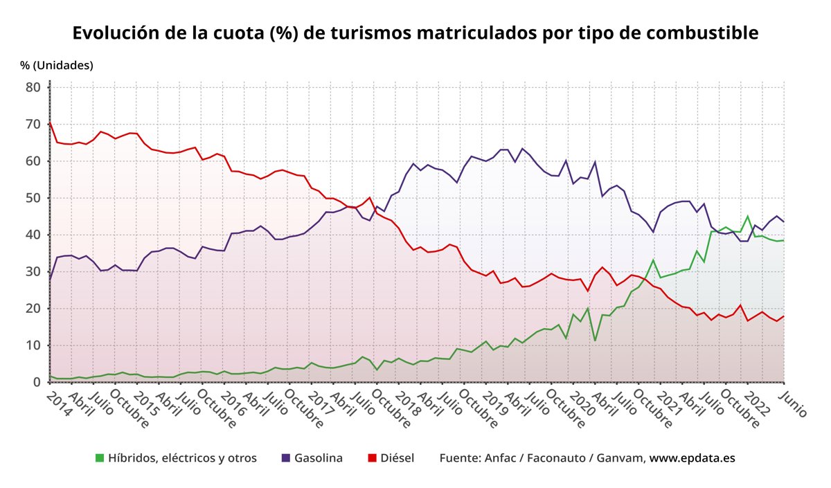 Evolución de la cuota de matriculación de vehículos según el tipo de combustible en España - EPDATA