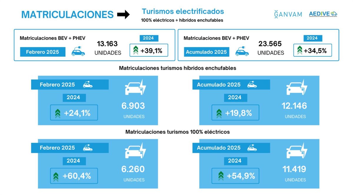 En total, durante febrero se matricularon en España un total de 14.546 vehículos electrificados (100% eléctricos e híbridos enchufables incluyendo a turismos, dos ruedas, comerciales e industriales), un 35% más que en el mismo mes del año anterior.