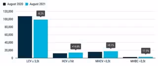 Gráfica comparativa de agosto 2020/2021 de las matriculaciones por tipo de vehículos comerciales - ACEA