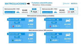 Por tipo de propulsión, las matriculaciones de vehículos cien por cien eléctricos de todo tipo --turismos, motocicletas, comerciales e industriales-- subieron un 32% en septiembre. En lo que va de 2024 reducen su caída hasta el 5,7%, tras totalizar las poco más de 49.970 unidades.