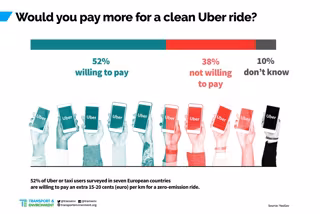 Más de la mitad (52%) de los clientes de Uber y taxi estarían dispuestos a pagar entre 15 y 20 céntimos de euro más por kilómetro por viajar en un coche eléctrico, según una encuesta llevada a cabo en siete países europeos por la compañía YouGov para la Federación Europea de ONG Transport & Environment (T&E).