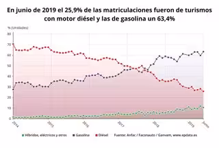 En lo que va de año, el 61,7% de las matriculaciones de turismos y todoterrenos en España correspondió a modelos de gasolina, con un 27,7% de modelos diésel y un 10,5% de coches impulsados con energías alternativas. En junio, el 63,4% de las entregas de coches en España fue de automóviles con motor de gasolina, en comparación con el 25,9% de modelos diésel y al 10,7% de vehículos de energías alternativas.