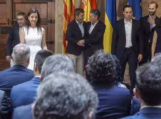 El president de la Generalitat Valenciana, Carlos Mazón (3i), y el CFO de Poweco Spain, Javier Rivera (3d), se sludan durante la firma del convenio de colaboración entre la Generalitat y PowerCo, en el Palau de la Generalitat, a 9 de julio de 2024. - Rober Solsona - Europa Press