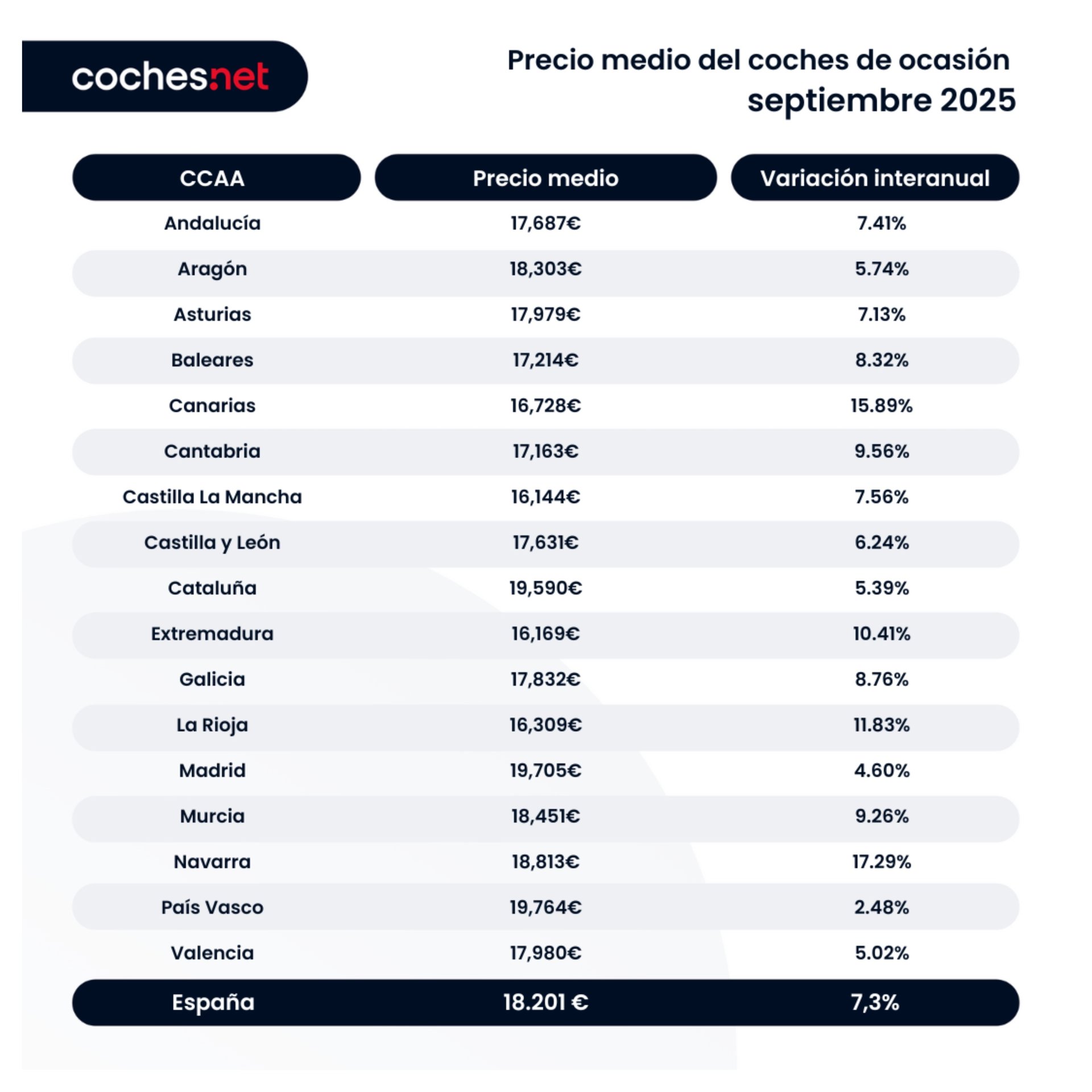 Al igual que en agosto, el precio del vehículo de ocasión creció en todas las comunidades autónomas de España. Navarra lideró el crecimiento con un fuerte repunte del 17,3%, alcanzando los 18.813 euros, seguida de Canarias (+15,9%, 16.728 euros) y La Rioja (+11,8%, 16.309 euros).